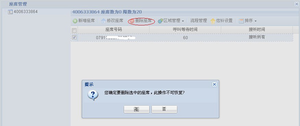 1.3) 刪除座席:單擊座席管理,彈出座席管理頁(yè)面,選擇需刪除的座席號(hào)碼,點(diǎn)擊刪除按鈕,將會(huì)彈出提示框,確定是否要?jiǎng)h除,單擊“是”。完成刪除操作,或單擊“否”,取消該操作 ,如下圖所示: