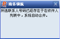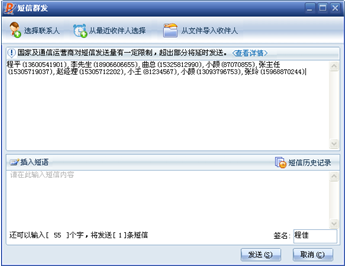 2、可在搜索框中輸入姓名、號碼、賬號進行查詢。選擇要發送短信的聯系人,短信發送對象(可選擇對方所有號碼,業務號碼優先,移動電話優先)點確定按鈕,選擇的聯系人號碼就都被導入到收件人編輯框中。